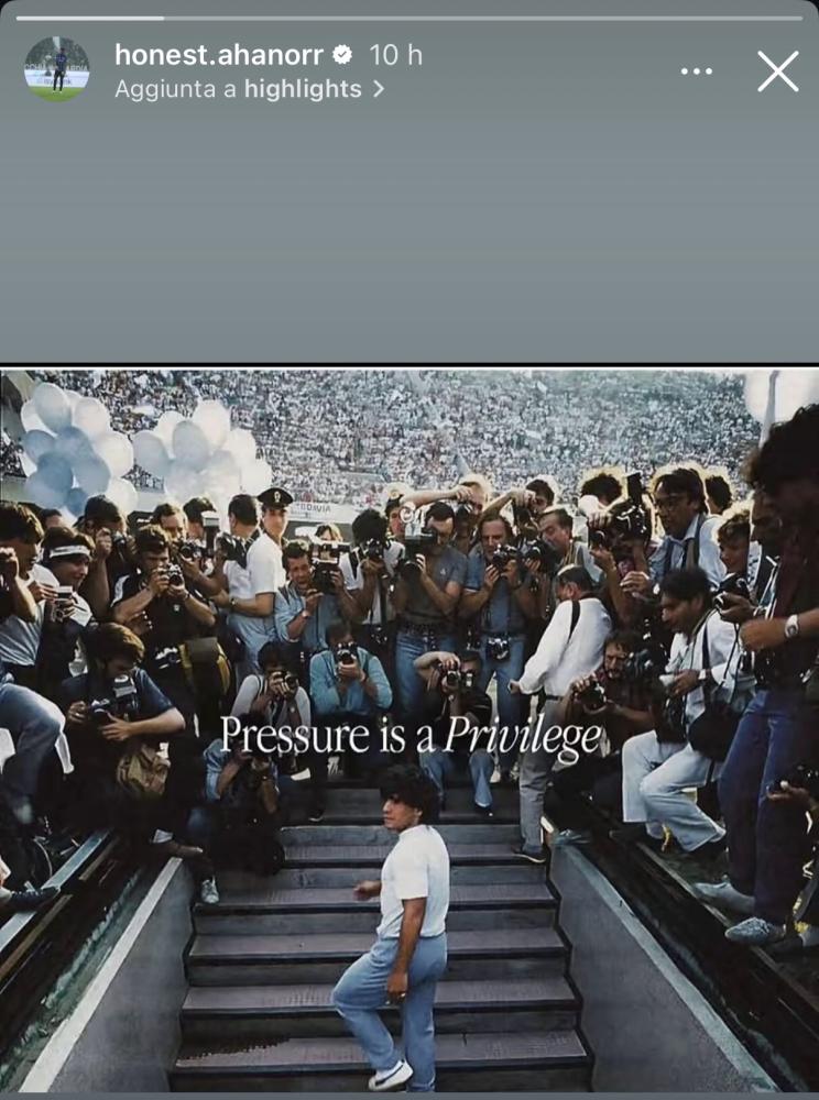 Ci sono frasi che raccontano più di mille parole, e un semplice post sui social può rivelare il carattere di un atleta meglio di qualunque intervista. Honest Ahanor, 17 anni appena compiuti, ha pubblicato una foto di Diego Armando Maradona che emerge dal tunnel del San Paolo, circondato da flash e applausi, accompagnandola con quattro parole: “Pressure is a privilege”.