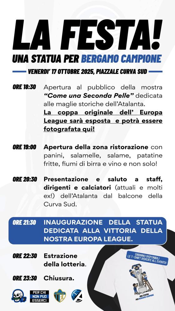 La festa si aprirà alle 18:30 in piazzale Curva Sud, con l’inaugurazione della mostra “Come una Seconda Pelle”, dedicata alle maglie storiche dell’Atalanta. A impreziosire l’evento ci sarà la coppa originale dell’Europa League, esposta per l’occasione e disponibile per essere ammirata e fotografata dai tifosi: un’occasione unica per rivivere da vicino la notte di Dublino.