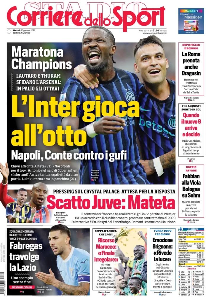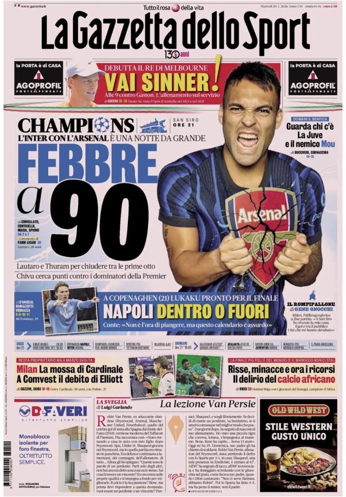 È il ritorno della Champions League a prendersi le prime pagine della maggior parte dei quotidiani sportivi nazionali e locali di oggi, martedì 20 gennaio. Super sfida a San Siro tra l’Inter e l’Arsenal prima della classe.