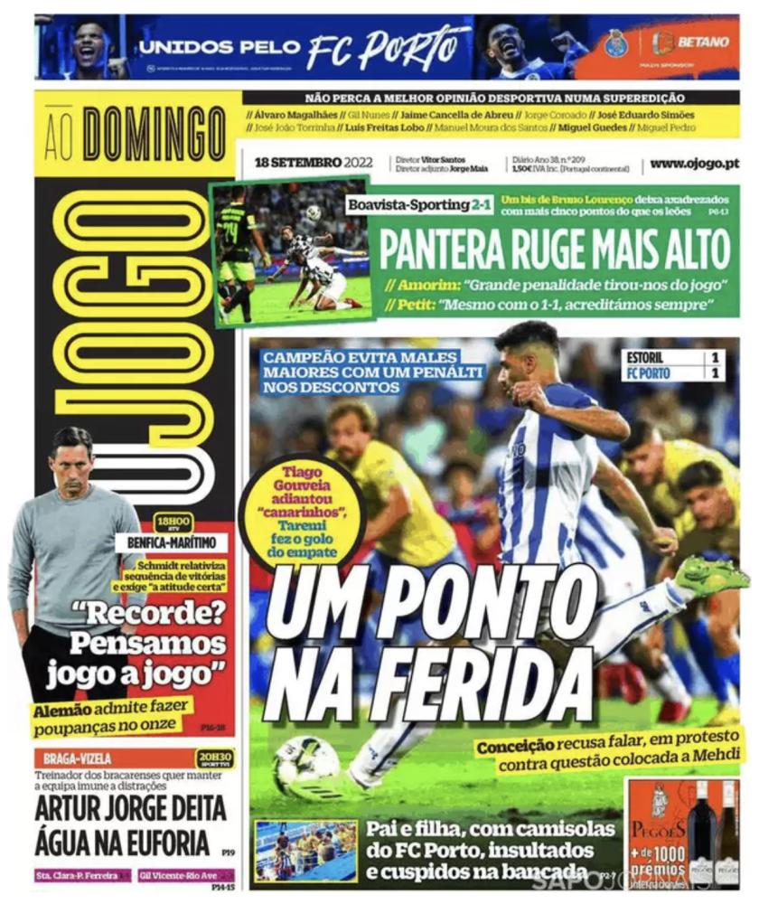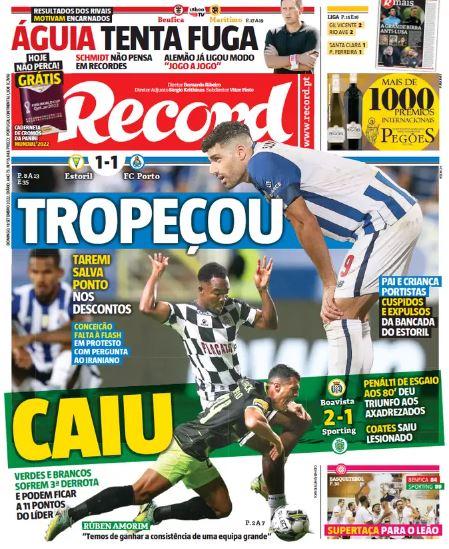 Il Porto non va oltre l'1-1 sul campo dell'Estoril, lo Sporting CP cade in casa del Boavista. Uno è "inciampato", l'altro è "caduto", come si legge nel titolo di Record. A Bola dedica l'apertura alla sconfitta del sodalizio di Lisbona: "Boavistao", si legge. "Un punto nella ferita", è infine il titolo di O Jogo su Estoril-Porto.