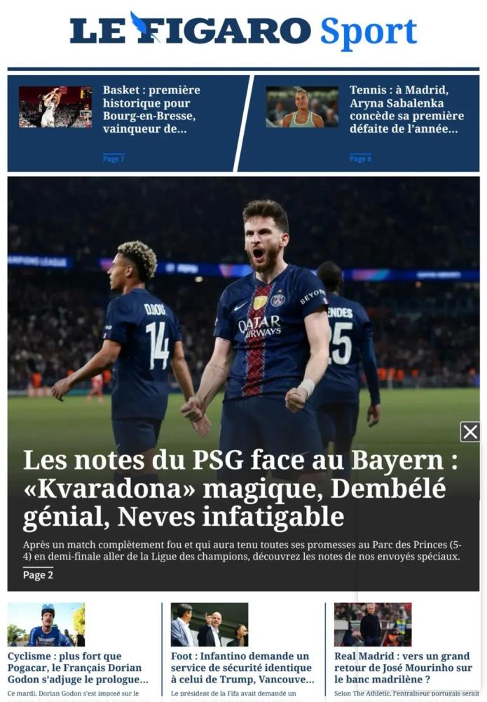L'Equipe in Francia in prima pagina lo celebra con un titolo eloquente: "Football total". Le Figaro sottolinea la prova dell'ex Napoli Kvaratskhelia, fra gli altri: "Kvaradona magique, Dembele geniale, Neves infaticabile". Anche in Spagna lo spettacolo è stato apprezzato: "Un'ode al calcio", scrive il quotidiano iberico Sport oggi in edicola.