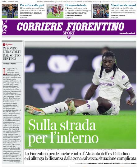"Sulla strada per l'inferno". Questo titolo, con una foto di un Moise Kean a terra, disperato, campeggia sulla prima pagina di oggi del Corriere Fiorentino. "La Fiorentina perde anche contro l'Atalanta dell'ex Palladino e si allunga la distanza dalla zona salvezza: situazione complicata" scrive il quotidiano locale, che dedica la sua edizione del lunedì alla crisi senza fine dei viola. Ecco la prima pagina: