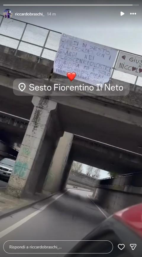 È il momento di Riccardo Braschi. Il giovane attaccante viola, fresco di esordio in Prima Squadra e in Europa con la maglia della Fiorentina nella vittoria di giovedì sera contro il Rakow, ha postato con orgoglio sulle proprie Instragram Story uno striscione che i tifosi gli hanno dedicato dopo il traguardo appena tagliato: "Dalle magie nei campetti di Sesto all’esordio con i grandi nei palcoscenici d’Europa ed è solo inizio, siamo fieri di te ovunque tu vada. I tuoi fratelli", recita il telo srotolato sopra un cavalcavia di Firenze, immortalato e pubblicato da Braschi in mattinata. Ecco l'immagine: