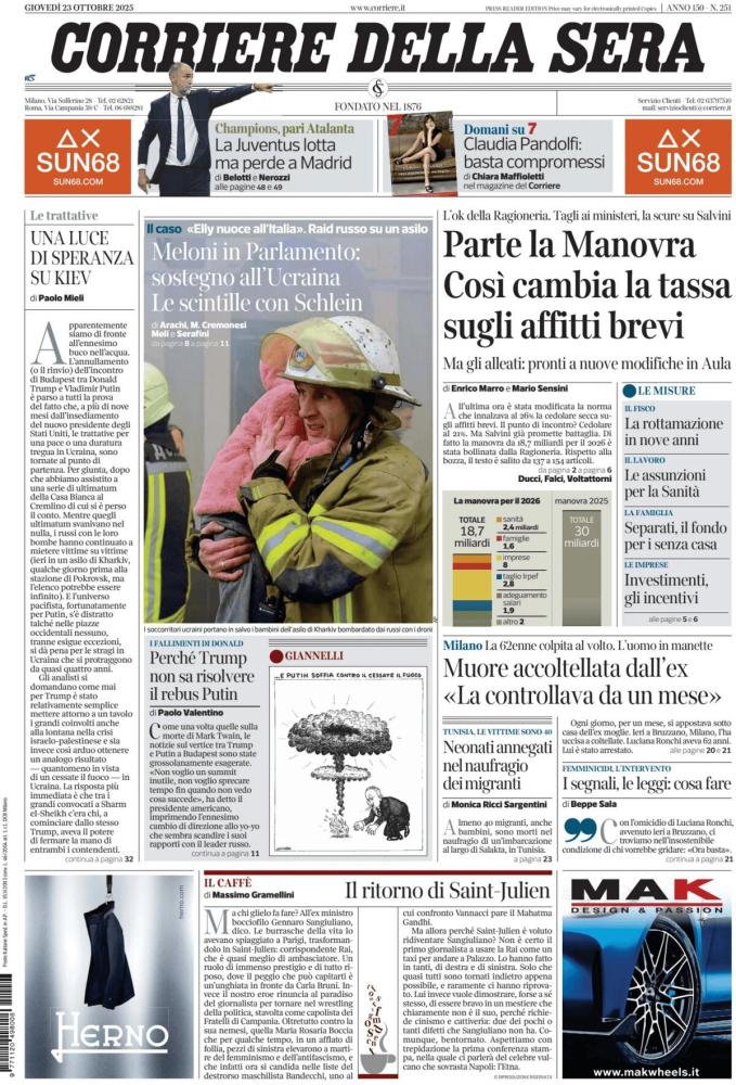 Le prime pagine dei quotidiani italiani e stranieri di oggi, giovedì 23 ottobre