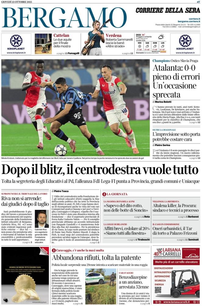 Le coppe europee sono l'argomento principale trattato oggi, giovedì 23 ottobre, sulle prime pagine dei più importanti quotidiani sportivi italiani. Si parte della Champions League che nella serata di ieri ha visto Juventus e Atalanta rispettivamente perdere con il Real Madrid e pareggiare con lo Slavia Praga nella terza giornata della League Phase, ma anche di Europa e Conference League: le tre squadre italiane impegnate nella competizione sono la Roma, attesa dal match dell'Olimpico contro il Viktoria Plzen, il Bologna che fa visita alla Steaua Bucarest e infine la Fiorentina, in campo alle 18.45 sul campo del Rapid Vienna.