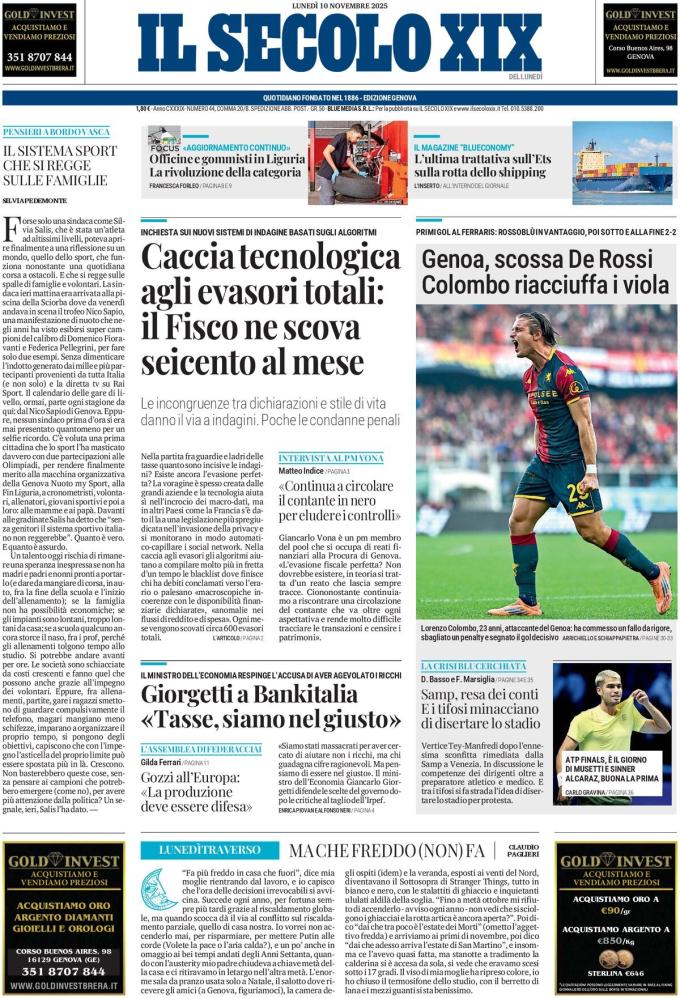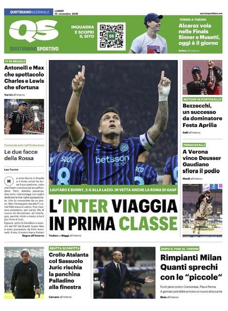 Sulle prime pagine dei quotidiani sportivi italiani quest'oggi spicca l'undicesima giornata appena conclusa con Roma e Inter che sono a pari punti in vetta alla classifica. Il crollo del Napoli a Bologna e il pareggio di sabato del Milan a Parma hanno permesso a Inter e Roma di mettere la freccia e di accelerare nella lotta scudetto. Ieri la squadra di Gasperini ha battuto in casa l'Udinese per 2-0 e lo stesso ha fatto l'Inter in casa contro la Lazio.