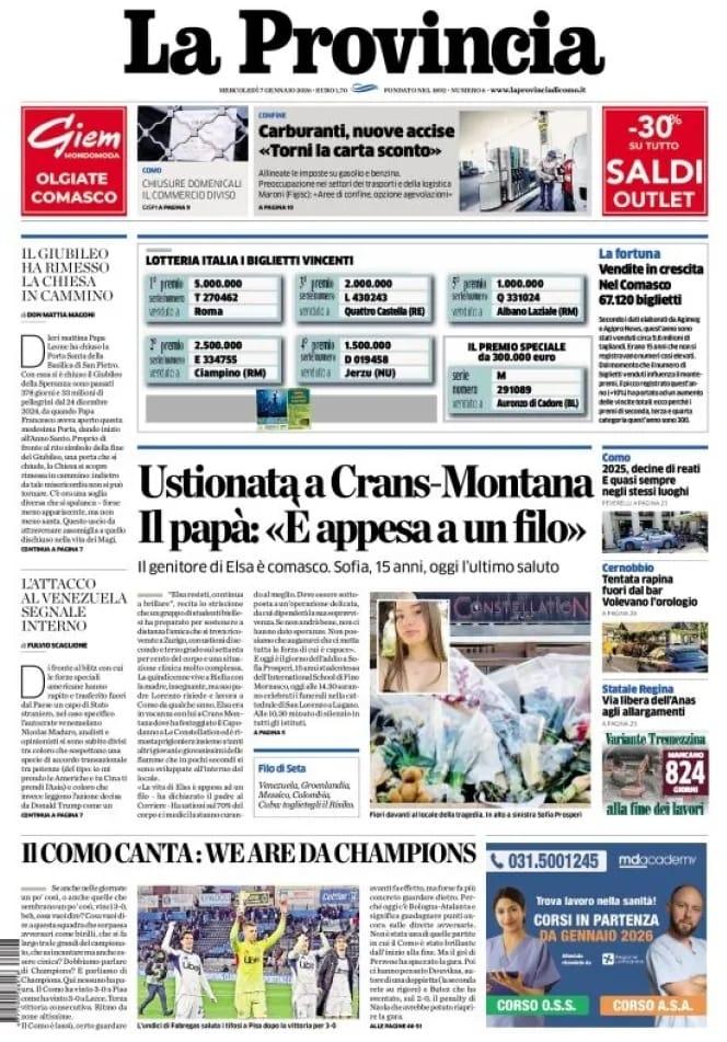 I risultati di Serie A sulle prime pagine dei quotidiani in edicola quest'oggi, mercoledì 7 gennaio 2026. Quanto spazio dedicato al ritorno al trionfo della Juventus, da tappeto rosso a Reggio Emilia contro il Sassuolo e con la super prestazione di Jonathan David: la punta canadese ha reagito alle critiche mosse dopo il rigore "moscio" calciato contro il Lecce sfornando un gol e un assist ai danni dei neroverdi. Rilanciando così Spalletti e i bianconeri al quarto posto, ricacciando il Como magico di Fabregas in sesta posizione. Anche la Roma di Gasperini non ha sbagliato, archiviato lo scivolone a Bergamo contro l'Atalanta: Lecce liquidato 2-0, nel segno di Ferguson e Dovbyk, con i giallorossi a pari punti della Vecchia Signora e in piena corsa Champions. Oggi viene il turno dell'Inter in casa del Parma, ma ancora prima il Napoli ospiterà il Verona al Maradona e Conte non potrà contare su Neres, infortunato. Intanto spiccano notizie di mercato e soprattutto la rescissione consensuale imminente tra Edoardo Bove e la Roma: il centrocampista italiano, dopo il malore e il defibrillatore sottocutaneo (ICD), vuole ritornare a giocare a distanza di 18 mesi: per farlo dovrà lasciare l'Italia, dove per legge è impossibilitato a tornare a giocare, mentre la Premier League lo attende.