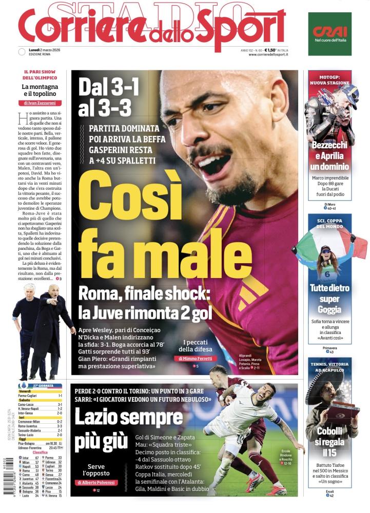 Attualmente la Lazio si trova decima a 34 punti in classifica, a due lunghezze di distanza dal Bologna e a quattro dal Sassuolo. La formazione di Sarri è sopra solo di un punto rispetto al Parma e rischia di scendere addirittura all'undicesimo posto in caso di vittoria dell'Udinese (contro la Fiorentina nel posticipo). Di seguito la prima pagina del quotidiano.