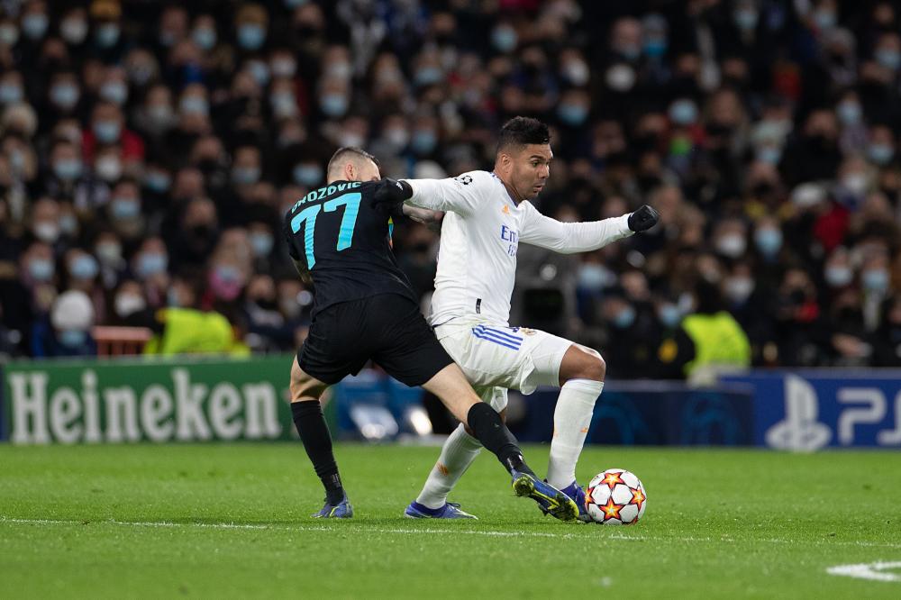 Madrid, Champions League 2021/2022, Real Madrid CF-Inter, giocata allo stadio Santiago Bernabeu, nella foto: Casemiro y Marcelo Brozovic