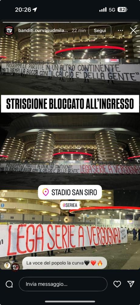 Striscione bloccato all'ingresso a San Siro. Il gruppo Curva Sud Milano ha postato in una storia Instagram il contenuto dello striscione che è un attacco alla Lega Serie A, rea di aver permesso la disputa di Milan-Como a Perth, in Australia.