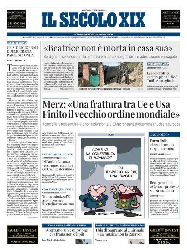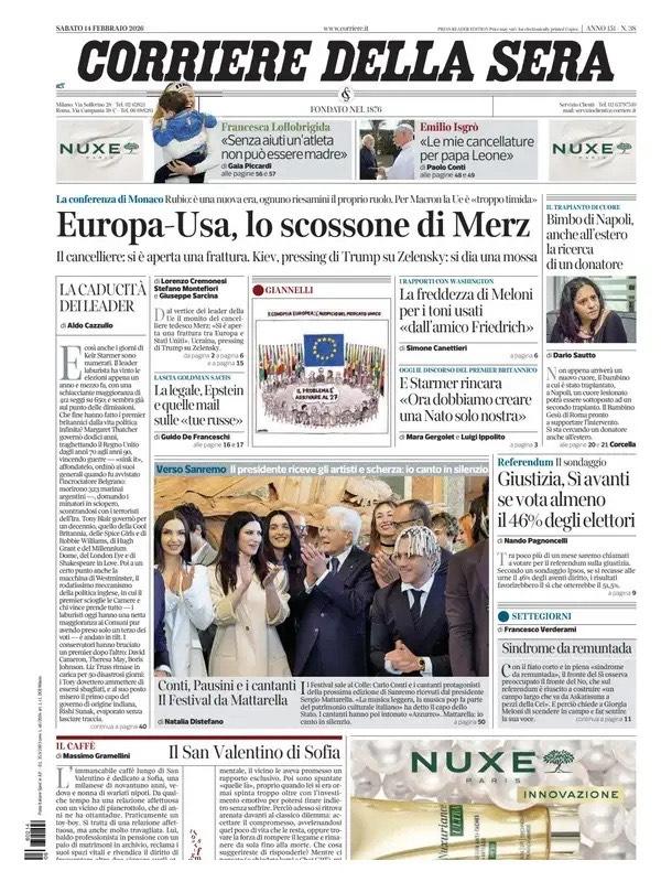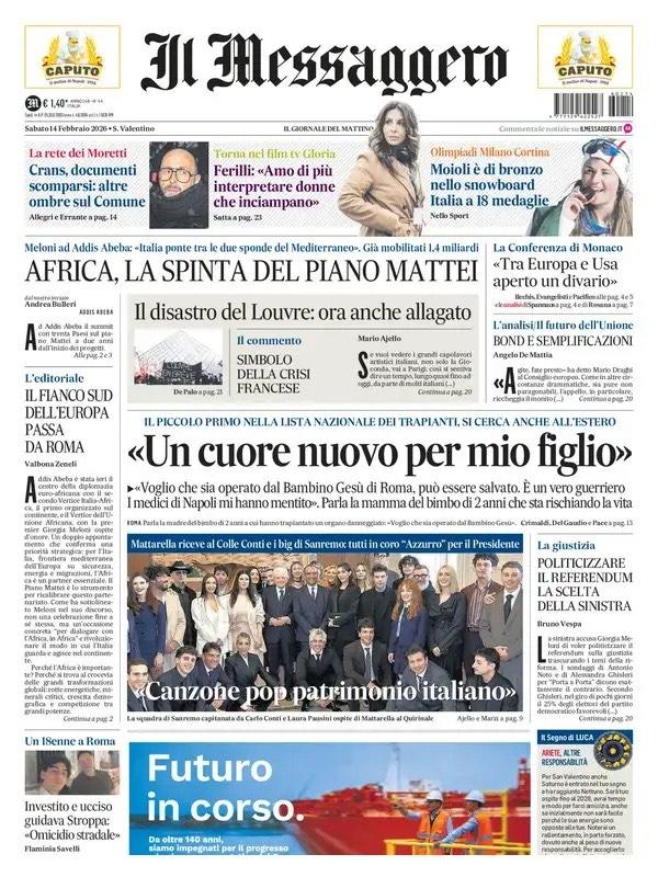 Le principali aperture dei quotidiani italiani e stranieri di sabato 14 febbraio 2026