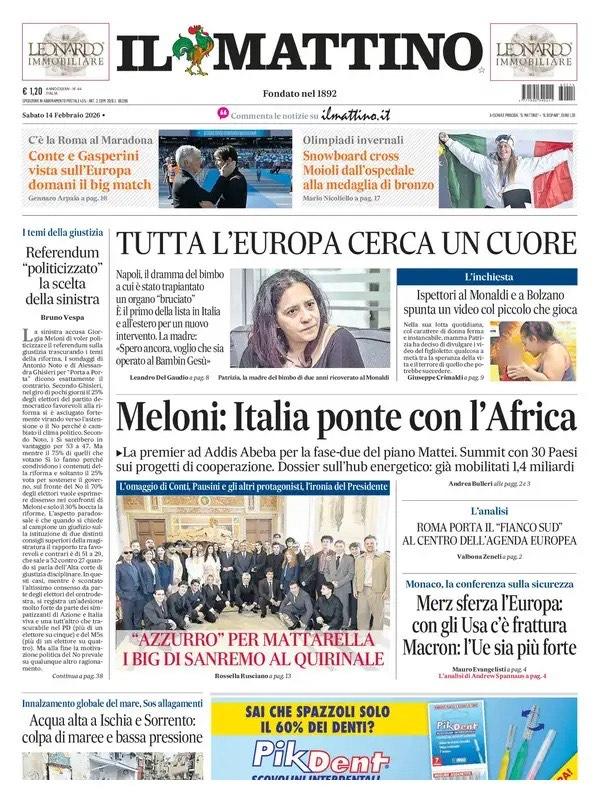 Le principali aperture dei quotidiani italiani e stranieri di sabato 14 febbraio 2026TUTTO mercato WEB