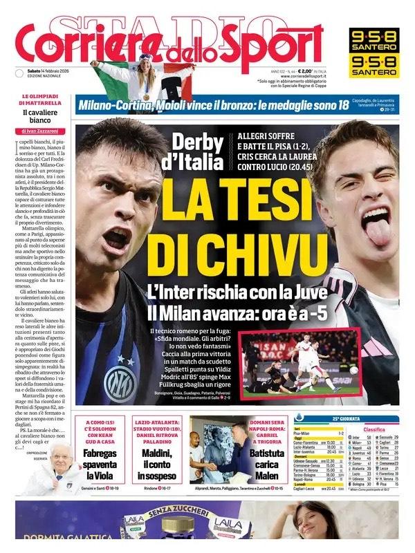 Le prime pagine dei quotidiani sportivi accendono i riflettori sul derby d’Italia e sulle sue ripercussioni nella corsa al titolo: l’Inter chiamata a difendere il primato, la Juventus a sfruttare lo scontro diretto per accorciare, con il Milan che resta in scia a -5 e osserva interessato. Titoli forti e analisi tattiche accompagnano il racconto di una sfida che può indirizzare la stagione. Ampio spazio agli episodi chiave, tra rigori sbagliati, polemiche arbitrali e scelte tecniche discusse. Focus sui singoli, sulle condizioni dei big e sugli equilibri nei reparti, mentre si allarga lo sguardo anche alla zona Champions e alla lotta salvezza, in un turno che promette di pesare su più fronti della classifica. Non mancano gli approfondimenti sul momento delle altre protagoniste, tra panchine sotto osservazione, strategie di mercato e rendimento dei nuovi acquisti. I quotidiani analizzano numeri, calendario e incroci diretti, delineando scenari e possibili ribaltoni in una settimana che si annuncia decisiva per obiettivi e gerarchie.