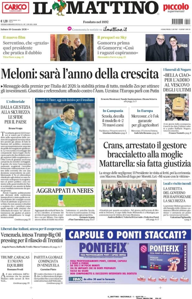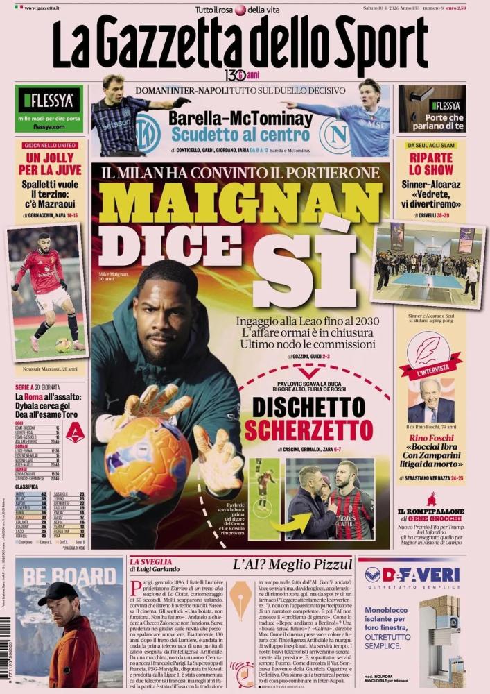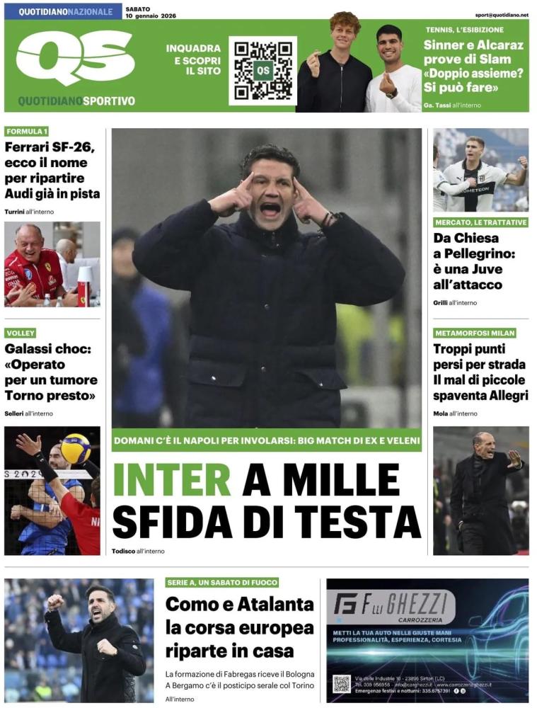 Il ritorno della Serie A con un nuovo turno di campionato è uno dei temi principali delle prime pagine di oggi, sabato 10 gennaio. Spicca ovviamente Inter-Napoli, big match in programma domani sera: i nerazzurri possono portarsi a +7 dai rivali, che invece non vogliono perdere il treno per il titolo dopo il pareggio casalingo contro il Verona. Partita speciale per Zielinski, tra i più in forma della formazione di Chivu. Dubbio Neres per Conte.