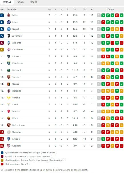 In attesa dell'Inter, in campo stasera, il Milan manda un altro grosso messaggio al campionato. I rossoneri battono per 2-0 la Lazio e si portano momentaneamente in vetta da soli, a +3 sui cugini nerazzurri. La Lazio prosegue nel suo avvio di stagione altalenante: solo 7 punti in classifica per i biancocelesti staccati ormai di 11 lunghezze dalla vetta. Di seguito la classifica aggiornata: