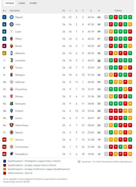 La Juventus vince una partita pazza contro la Sampdoria e scavalca in classifica sia il Torino sia il Bologna, portandosi a -4 dall'Atalanta e quindi dal sesto posto. Questa la graduatoria aggiornata di Serie A in attesa dell'ultima sfida valida per il 26° turno: