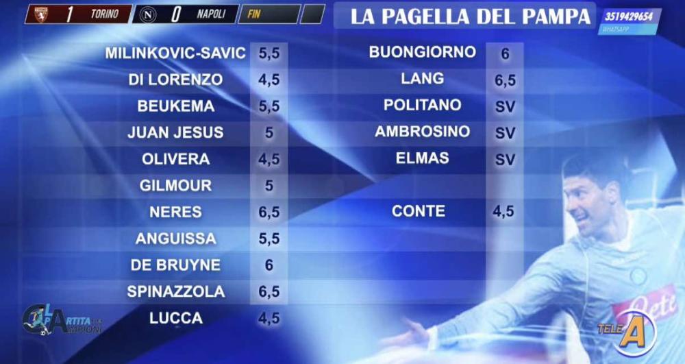 Peggiori in campo con 4,5 capitan Di Lorenzo, sfortunato e poco preciso sul gol granata, Olivera e Lucca, che non ha sostituito al meglio l'infortunato Hojlund. 4,5 anche per Antonio Conte, che non riesce a trovare una soluzione per battere la difesa più perforata della Serie A. Di seguito le pagelle del Pampa.