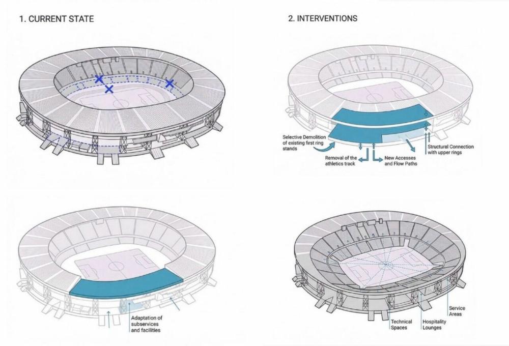 Tra le modifiche più rilevanti c’è la rimozione della pista d’atletica, che permetterà di avvicinare gli spalti al terreno di gioco e migliorare l’esperienza visiva degli spettatori. La progettazione delle gradinate seguirà criteri avanzati di visibilità, con verifiche sulle linee di vista e sui valori di “C-value”, parametro utilizzato negli stadi moderni per garantire la visuale completa del campo da ogni posto. I lavori partiranno con due settori pilota, curva e distinti, che serviranno da modello per l’estensione dell’intervento a tutto il primo anello.