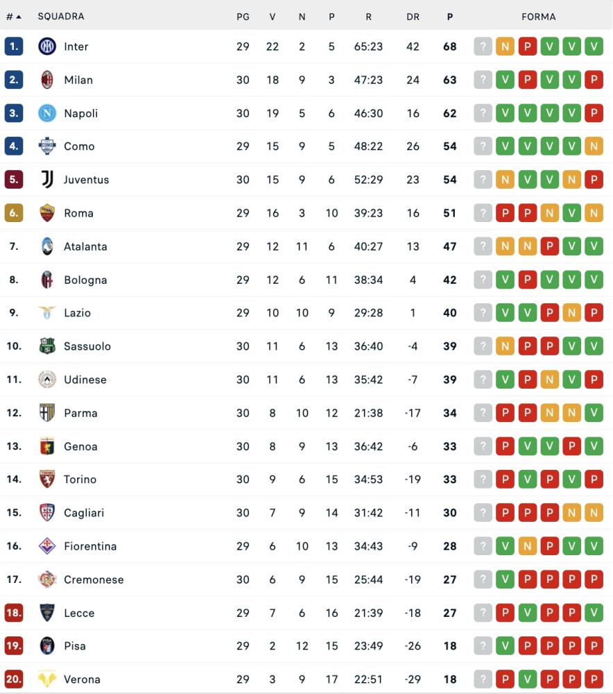 Di seguito la classifica aggiornata di Serie A: