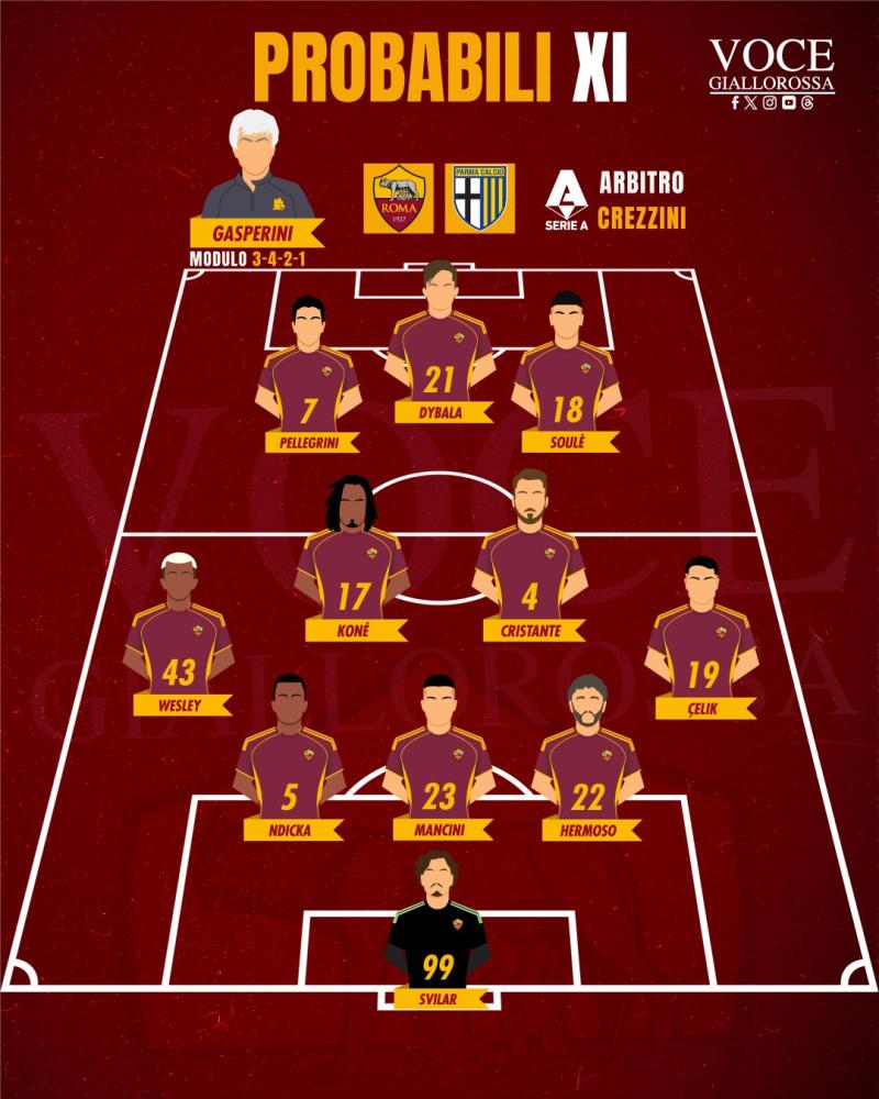 ROMA (3-4-2-1): Svilar; Hermoso, Mancini, Ndicka; Celik, Cristante, Koné, Wesley; Soulé, Pellegrini; Dybala.