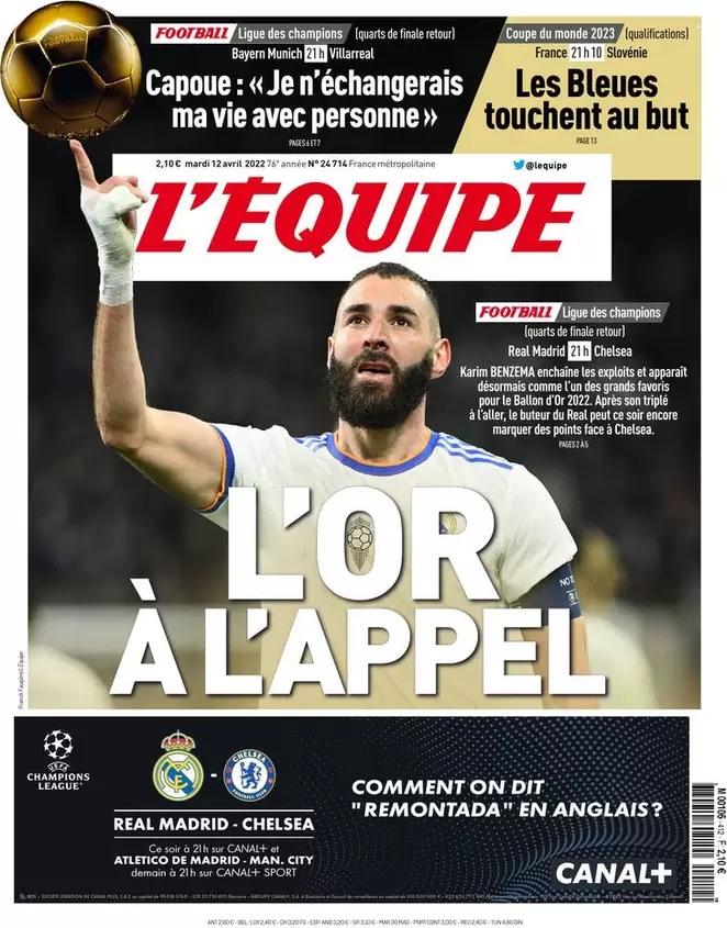"Oro all'appello" titola in prima pagina l'edizione odierna del quotidiano sportivo francese L'Equipe. Karim Benzema ha una serie di exploit e ora appare come uno dei grandi favoriti per il Pallone d'Oro 2022. Dopo la tripletta all'andata, l'attaccante del Real può ancora segnare punti al Chelsea questa sera.