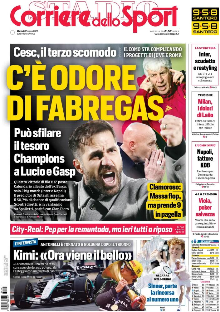"C'è odore di Fabregas". Titola così in prima pagina il Corriere dello Sport, che si concentra sulla lotta Champions e in particolar modo sul Como. I lariani al termine della 29esima giornata si sono presi il quarto posto in solitaria, volando a quota 54 dopo il 2-1 sulla Roma che vale anche come quarto successo di fila. Il Como gode di un punto di vantaggio sulla Juve e di tre sulla Roma, avendo anche un calendario più favorevole. Fabregas sta complicando i piani Champions di Juve e Roma, un tesoro che potrà sfilare alle due pretendenti al quarto posto.