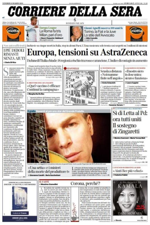 "La Roma fa tris. Milan, pari d'oro". Questo il titolo che il Corriere della Sera nell'edizione odierna utilizza nel taglio alto della prima pagina. Nel recupero i rossoneri rimontano lo United evitando la beffa. Il pari di Kjaer, meritato, è come una liberazione. Rabbia e dubbi per la rete annullata a Kessié. I giallorossi affondano lo Shakhtar 3-0 con i gol di Pellegrini, El Shaarawy e Mancini.