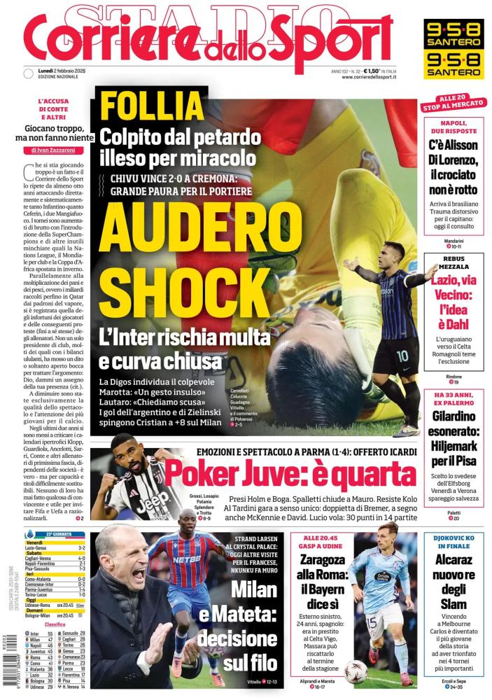 "Audero shock". Titola così in prima pagina Il Corriere dello Sport, che si sofferma su quanto accaduto nel corso di Cremonese-Inter. Il portiere grigiorosso infatti all'inizio del secondo tempo è stato colpito da un petardo, lanciato dal settore dei tifosi interisti. Un gesto inaccettabile che ha comportato la temporanea sospensione del match e che è stato condannato fortemente da parte di tutti e giocatori e della dirigenza interista.