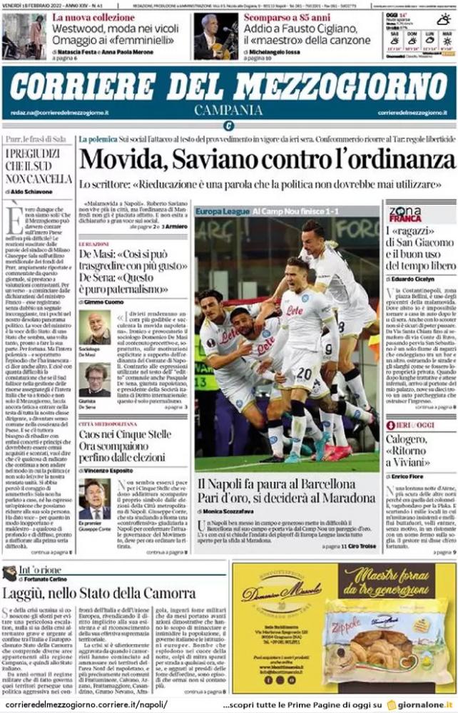 L'apertura odierna del Corriere del Mezzogiorno dedica il taglio centrale al pareggio raccolto dal Napoli al Camp Nou: "Il Napoli fa paura al Barcellona: pari d'oro, si deciderà al Maradona", titola il quotidiano. Azzurri generosi e ben messi in campo: risultato che lascia tutto aperto in vista del ritorno al Maradona.