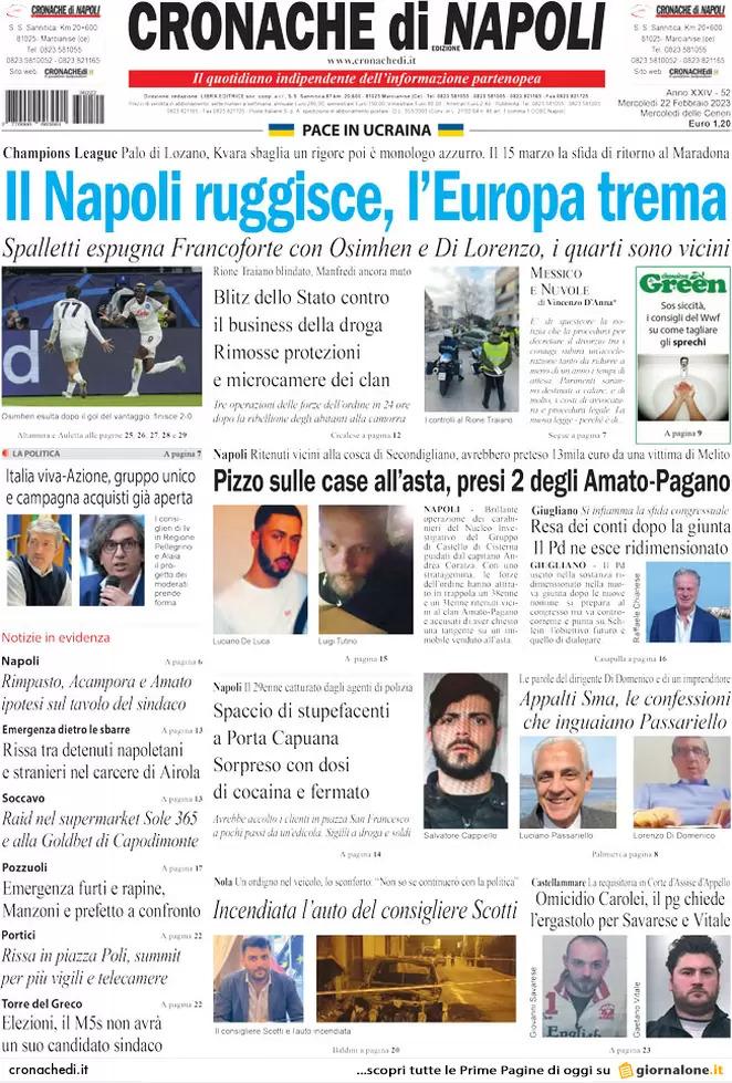 "Il Napoli ruggisce, l'Europa trema" è il titolo che campeggia al centro dell'apertura odierna di Cronache di Napoli. Spalletti espugna Francoforte con Osimhen e Di Lorenzo, i quarti sono vicini. Palo in avvio di Lozano, Kvara sbaglia un rigore, poi è monologo azzurro. Il 15 marzo la sfida di ritorno al Maradona.