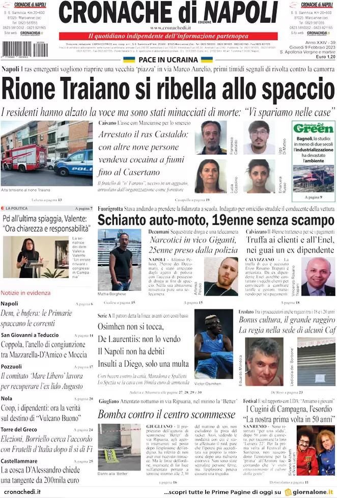"Osimhen non si tocca. De Laurentiis: 'Non lo vendo, il Napoli non ha debiti'", l'apertura di Cronache di Napoli nell'edizione odierna. Il numero uno del Napoli non ne vuole sapere di prezzi per il suo bomber d'attacco: Victor Osimhen non è in vendita. A prescindere dagli interessamenti emersi negli ultimi giorni tra big di Premier League e Bayern Monaco. Come spiega il presidente, il Napoli è un club in salute a livello di bilancio, non ha bisogno di entrate ingenti e men che meno di vendere il suo attaccante. Insulti a Diego Maradona a La Spezia per l'ultimo match, il club ligure se la cava con 10 mila euro di ammenda.