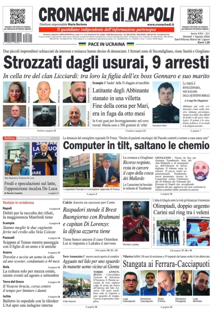 "Raspadori stende il Brest. Buongiorno con Rrahmani e Di Lorenzo: la difesa azzurra tiene" è il titolo che si legge nella prima pagina di Cronache di Napoli in merito all'amichevole vinta dal Napoli contro il Brest. Ancora un successo per Antonio Conte in questa parte di pre campionato. Fronte mercato tiene banco ancora il caso Osimhen: l'attaccante si impunta e intanto Lukaku che aspetta la sua uscita è nervoso.