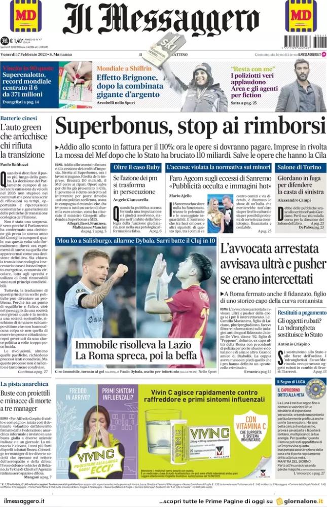 Il Messaggero nella sua edizione odierna si occupa in prima pagina dei risultati ottenuti da Lazio e Roma in campo internazionale. Mou ko a Salisburgo, allarme Dybala - si legge - Sarri batte il Cluj in 10. Ecco il titolo: “Immobile risolleva la Lazio. La Roma spreca, poi la beffa”.