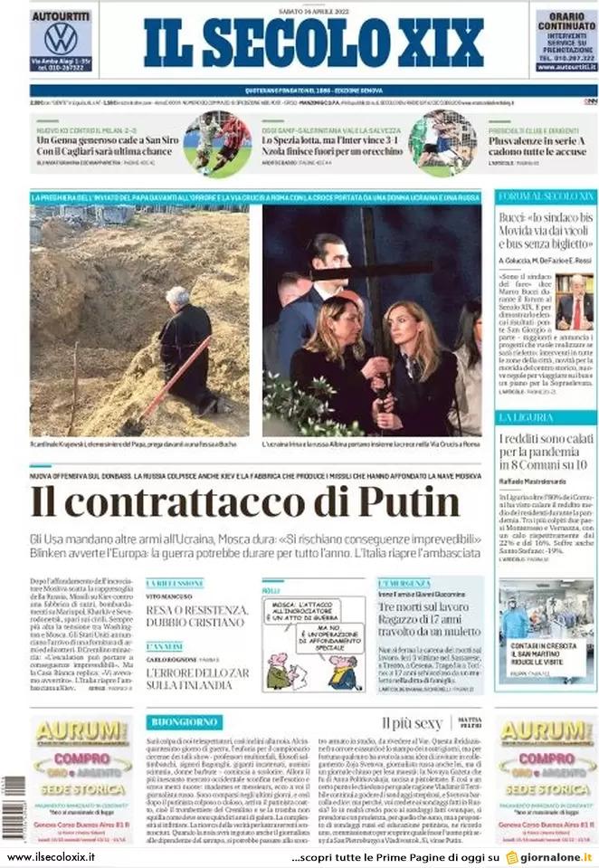 "Un Genoa generoso cade a San Siro, con il Cagliari sarà ultima chance". Così in taglio alto l'edizione odierna de Il Secolo XIX, che inquadra in questo modo il momento dei rossoblù dopo il k.o. di ieri contro il Milan: lo scontro diretto con i sardi sarà a tutti gli effetti l'ultima spiaggia per la salvezza. Spazio, sempre in taglio alto, anche alla sconfitta dello Spezia: "Lo Spezia lotta, ma l'Inter vince 3-1: Nzola finisce fuori per un orecchino".