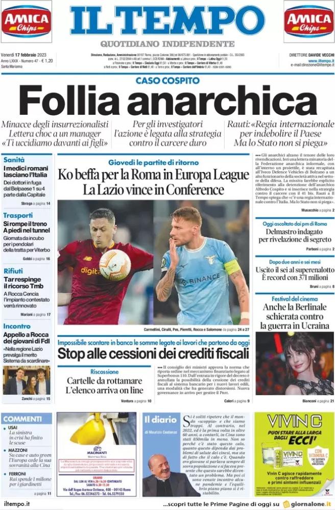 Questa mattina Il Tirreno si sofferma sui risultati ottenuti nelle rispettive gare di coppa dalle due squadre capitoline. Ecco il titolo in prima pagina proposto dal quotidiano in edicola: “Ko beffa per la Roma in Europa League. La Lazio vince in Conference”. Giovedì - si legge - le partite di ritorno.