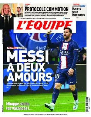 "Messi a deux amours" è il titolo della prima pagina di oggi de L'Equipe. Dopo aver trascinato l'Argentina alla vittoria del suo terzo Mondiale, la Pulce sta per prolungare il suo contratto con il PSG. Un vero affare per la Ligue 1, che potrà ancora vantare il miglior giocatore al mondo.