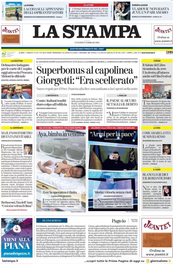“Vlahovic non basta. Juve, un pari amaro” titola in prima pagina l’edizione odierna del quotidiano torinese La Stampa. Focus sull’1-1 rimediato dai bianconeri in Europa League contro il Nantes (a Vlahovic risponde Blas), risultato che delega tutto dunque alla gara di ritorno in programma giovedì 23 febbraio alle ore 18:45.