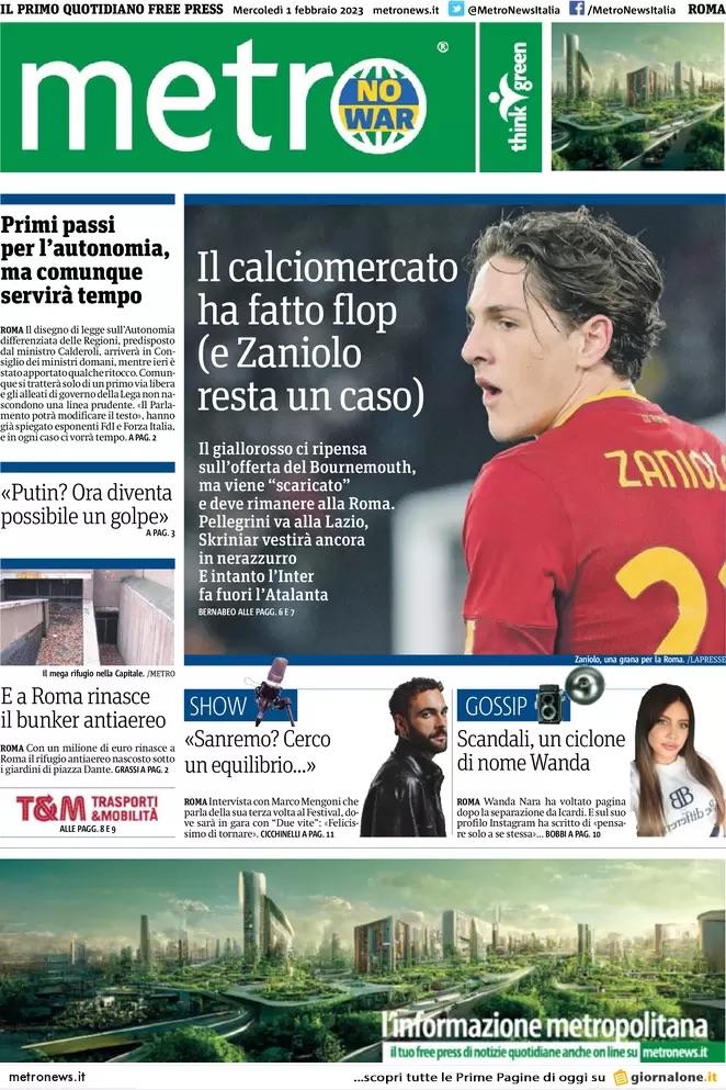 Metro in apertura questa mattina: “Il calciomercato ha fatto flop (e Zaniolo resta un caso)”