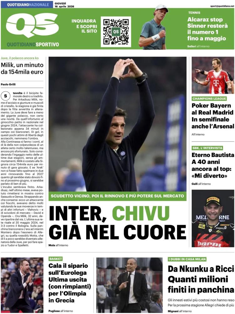 Il 4-3 inferto al Como ha dato ampie speranze all'Inter di chiudere in anticipo la corsa Scudetto rispetto alla passata stagione. Il +9 consolidato ai danni del Napoli dà sicuramente margini importanti ai nerazzurri, che nei prossimi impegni cercheranno di chiudere i discorsi acquisendo la matematica certezza del titolo. Nel frattempo il club nerazzurro ha già scelto il suo futuro: "Chivu già nel cuore", la prima pagina del Quotidiano Sportivo stamane.