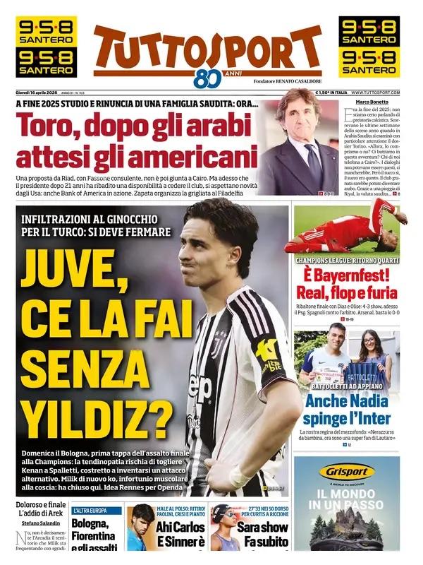 La prima pagina dell'edizione odierna di Tuttosport si apre con una domanda che il quotidiano pone alla Juventus: "Juve, ce la fai senza Yildiz? Infiltrazioni al ginocchio per il turco: si deve fermare", si legge nell'apertura del giornale torinese: "Domenica il Bologna, prima tappa dell'assalto finale alla Champions: la tendinopatia rischia di togliere Kenan a Spalletti, costretto a inventarsi un attacco alternativo. Milik di nuovo ko, infortunio muscolare alla coscia: ha chiuso qui. Idea Rennes per Openda".