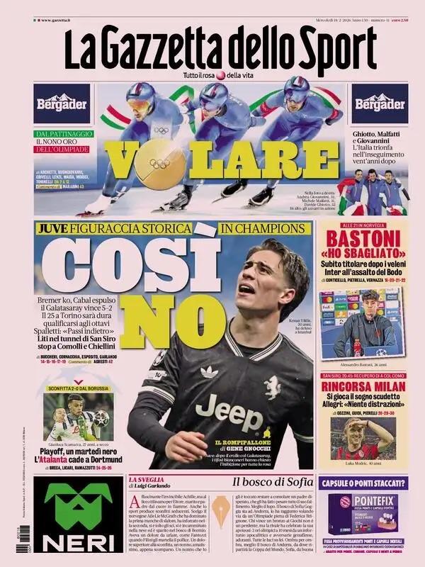 "Così no" è il titolo di apertura scelto oggi da La Gazzetta dello Sport per la prima pagina dedicata alla Juventus, sconfitta ieri con un netto 5-2 contro il Galatasaray nell'andata dei playoff di Champions League: "Juve, figuraccia storica in Champions - prosegue il quotidiano -. Bremer ko, Cabal espulso: il Galatasaray vince 5-2. Il 25 a Torino sarà dura qualificarsi agli ottavi. Spalletti: 'Passi indietro'. Liti nel tunnel di San Siro, stop a Comolli e Chiellini". Va ko anche l'Atalanta, battuta 2-0 in Germania dal Borussia Dortmund: "Playoff, un martedì nero. L'Atalanta cade ai playoff".