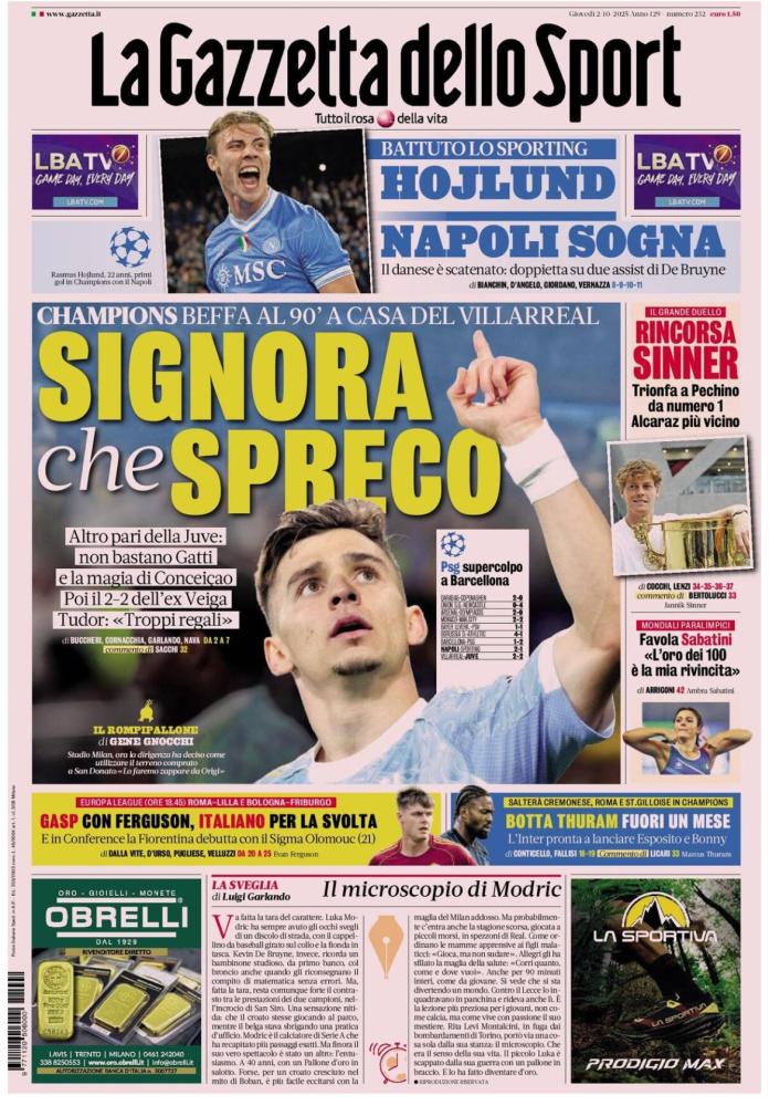 Dopo le vittorie di Inter e Atalanta di martedì, trionfa anche il Napoli di Antonio Conte, trascinata da un super Rasmuns Hojlund, autore di una doppietta, entrambi siglati su assist dell’uomo più chiacchierato della vigilia, ossia Kevin De Bruyne. Quarto pareggio di fila, invece, per la Juventus, che dopo il 4-4 al debutto col Borussia Dortmund fa 2-2 in casa del Villarreal. Dopo il vantaggio iniziale di Mikautadze, i bianconeri la ribaltano con le reti ad inizio ripresa di Gatti e Conceicao. Nel finale però l’ex Renato Veiga ristabilisce la parità.
