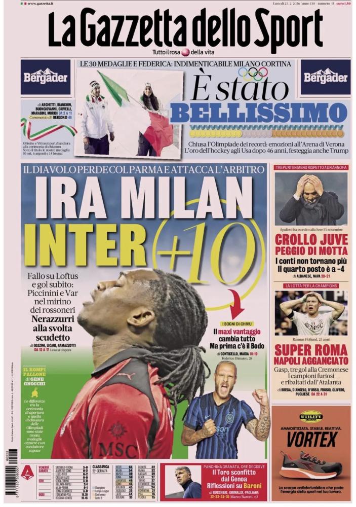 Polemiche anche in Milan-Parma per il gol assegnato a Troilo che ha permesso ai ducali di espugnare San Siro, mettere fine alla serie di 24 risultati utili consecutivi dei rossoneri, ma soprattutto di consegnare all'Inter una grossissima fetta di Scudetto, visti i 10 punti di vantaggio a 12 giornate dal termine. Come spesso le è successo in stagione, la squadra di Allegri va in difficoltà contro le 'piccole' e alla fine a spuntarla è Cuesta, che diventa il più giovane allenatore di sempre a vincere al Meazza