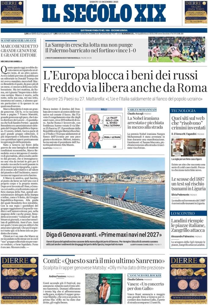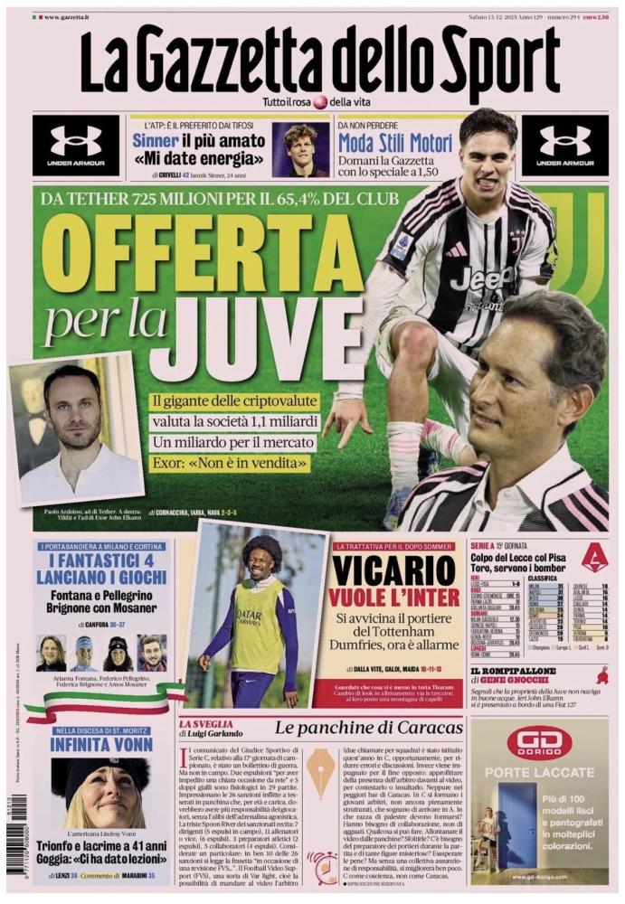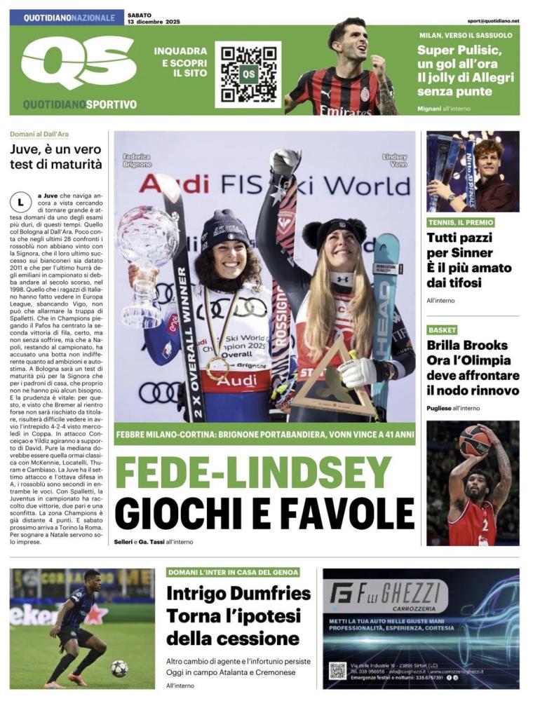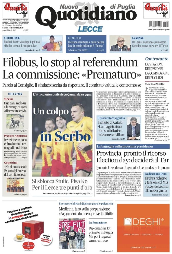 Il tema principale ch figura nelle prime pagine dei quotidiani sportivi nazionali e locali di oggi, sabato 13 dicembre, riguarda la quindicesima giornata di Serie A, che si è aperta ieri sera con l'1-0 inflitto dal Lecce al Pisa.