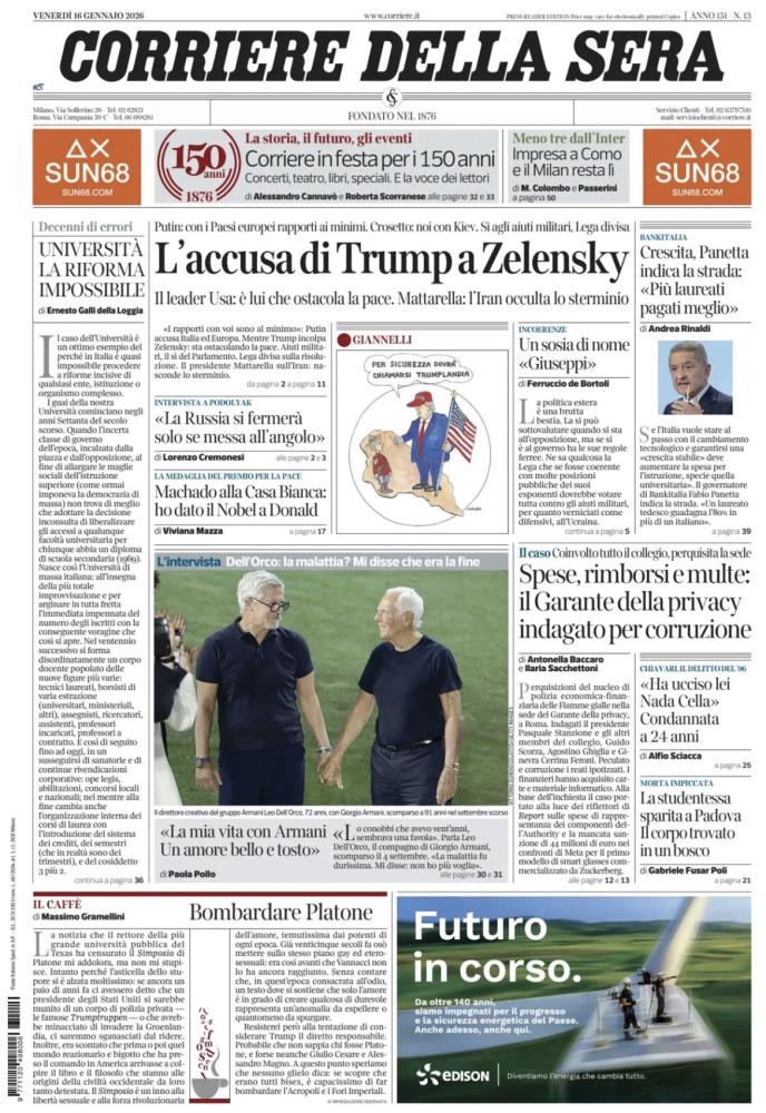 Le aperture dei quotidiani italiani e stranieri di oggi, venerdì 17 gennaio
