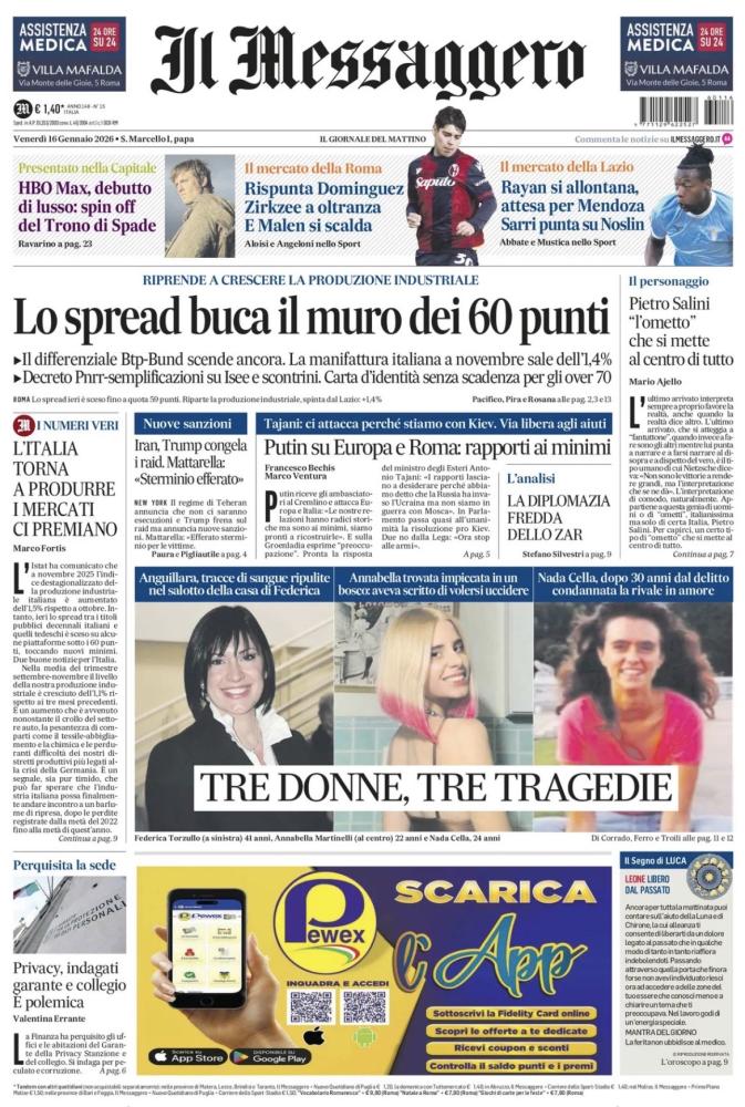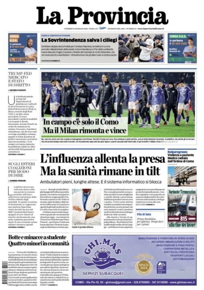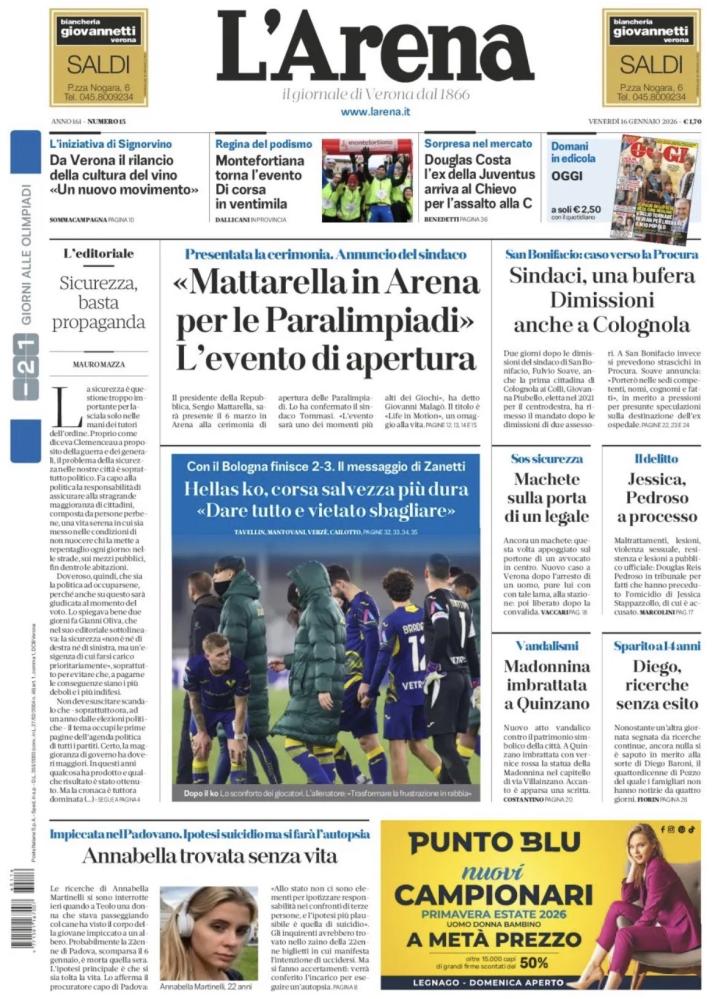 Tanto sport nelle prime pagine dei principali quotidiani sportivi - e non solo - nazionali e locali di quest’oggi, venerdì 16 gennaio 2026. In particolare spazio ai recuperi della Serie A della 16esima giornata, aperti mercoledì con la vittoria dell’Inter sul Lecce e il pareggio tra Napoli e Parma e proseguiti ieri con le vittorie di Bologna e Milan rispettivamente contro Hellas Verona e Como.