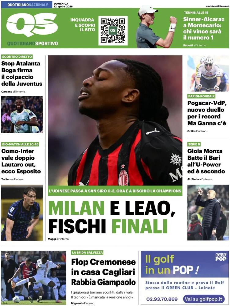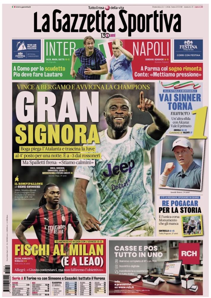 La Serie A in campo rappresenta uno dei temi principali delle prime pagine di oggi, domenica 12 aprile. Sabato decisamente di fuoco, soprattutto per quanto riguarda la zona Champions. In serata vittoria importantissima della Juventus a Bergamo contro l'Atalanta. Decisivo Boga, preso momentaneamente il quarto posto. Avvicinato anche il Milan, che nel pomeriggio è crollato a San Siro contro l'Udinese. Alle 15.00, infine, successi fondamentali in chiave salvezza di Cagliari e Torino contro Cremonese e Verona.