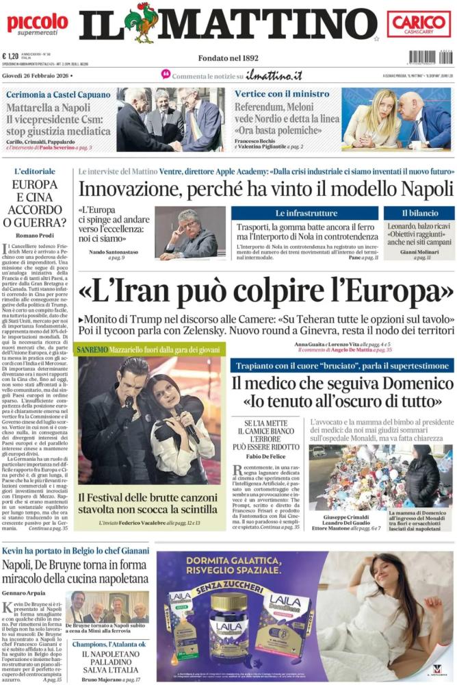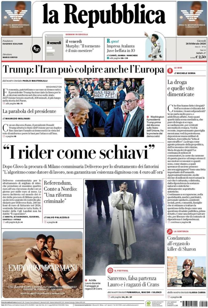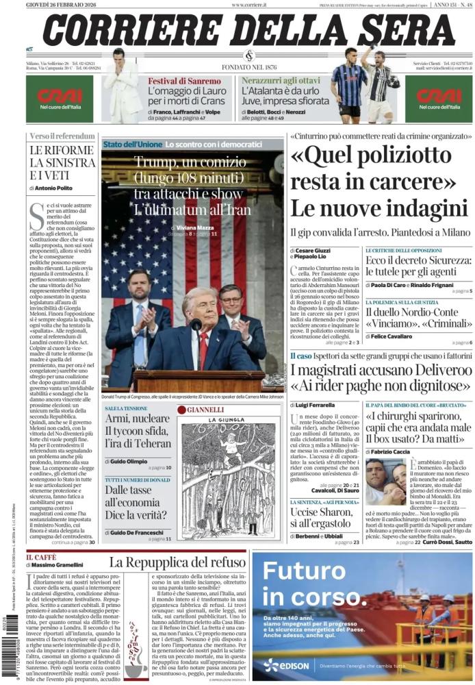 Le prime pagine dei quotidiani italiani e stranieri di oggi, giovedì 26 febbraio