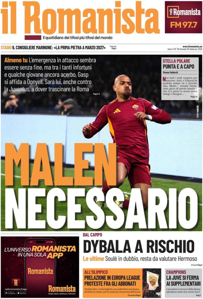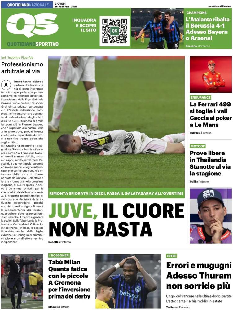 I verdetti di Champions League sono uno dei temi principali delle prime pagine di oggi, giovedì 26 febbraio. In bella mostra la rimonta eroica dell'Atalanta, che elimina il Borussia Dortmund con un 4-1 al ritorno in quel di Bergamo, determinante al 98' il rigore di Samardzic trasformato all'ultimo secondo. Non passa invece la Juventus, comunque commovente e ridotta in 10 contro 11 dall'espulsione di Kelly, capace di infliggere 3 gol al Galatasaray e trascinarlo ai tempi supplementari, finché Osimhen ha dato il colpo di grazia per il 3-2 finale.