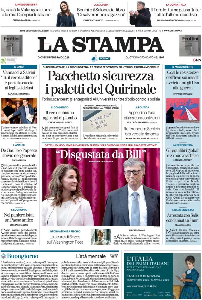 Le prime pagine dei quotidiani italiani e stranieri di oggi, giovedì 5 febbraio